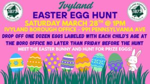 The Ivyland Borough Egg Hunt is scheduled for Saturday March 28th at 1PM on the lawn outside of the Borough Building on 991 Pennsylvania Ave.